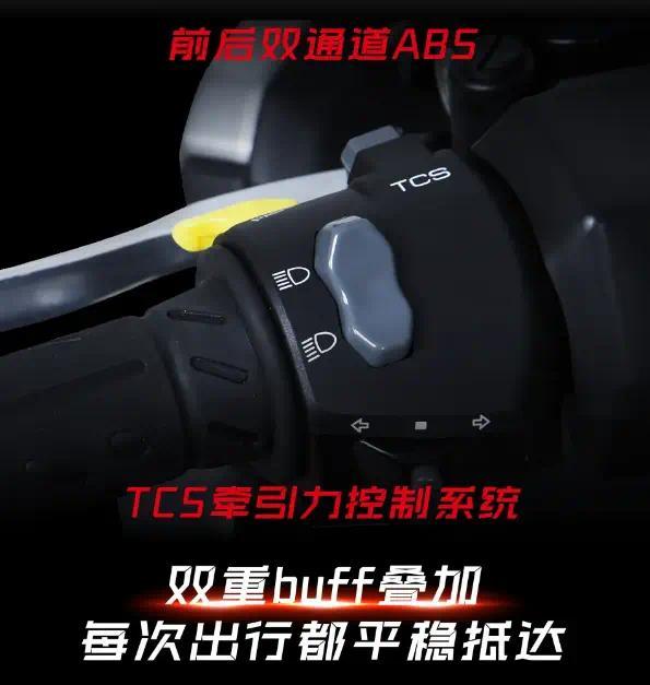 标配双通道ABS制动系统与TCS牵引力控制系统,同时设置独立按键可实现TCS实时开关,用户可根据路况自主选择开启或关闭,适配不同骑行场景。